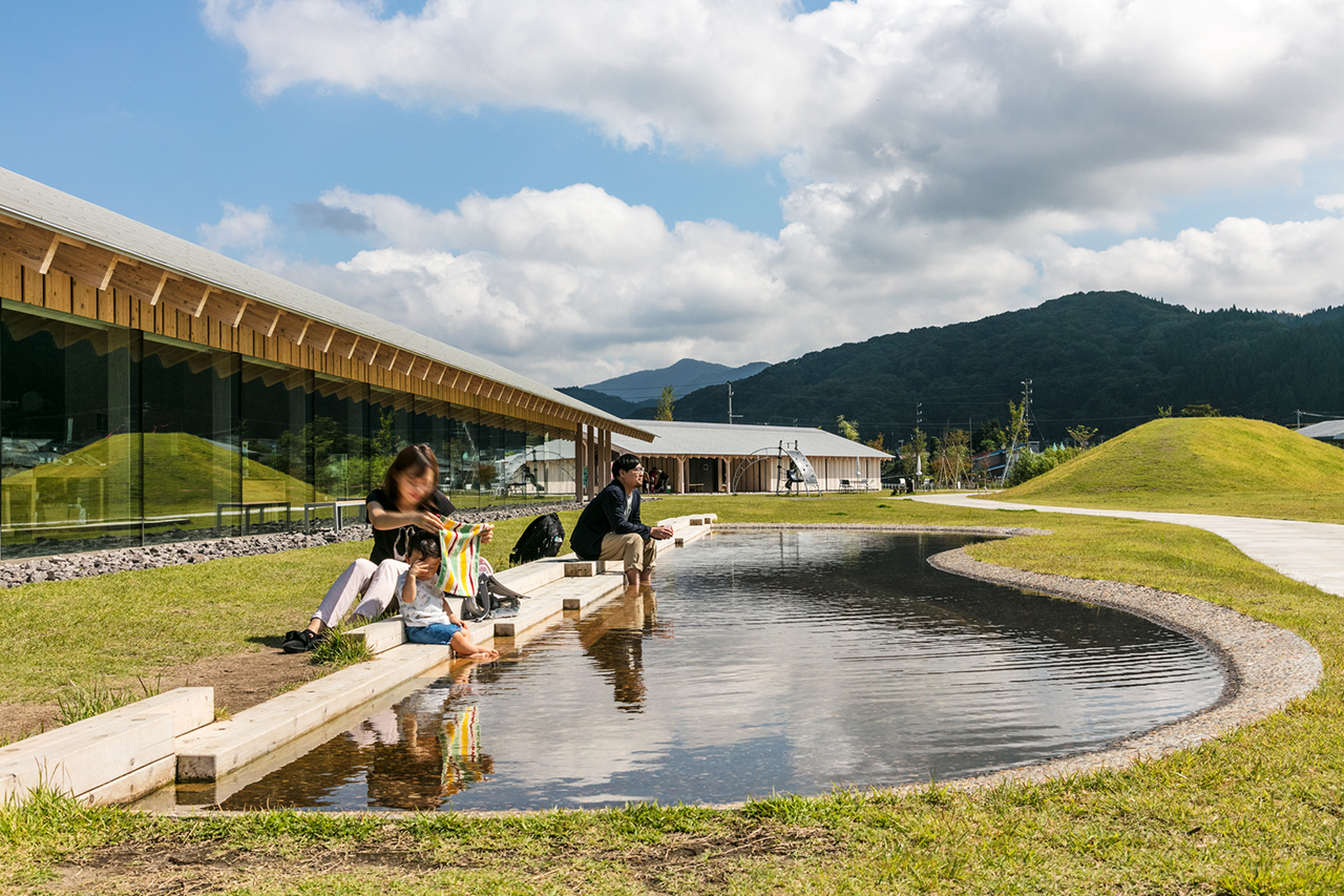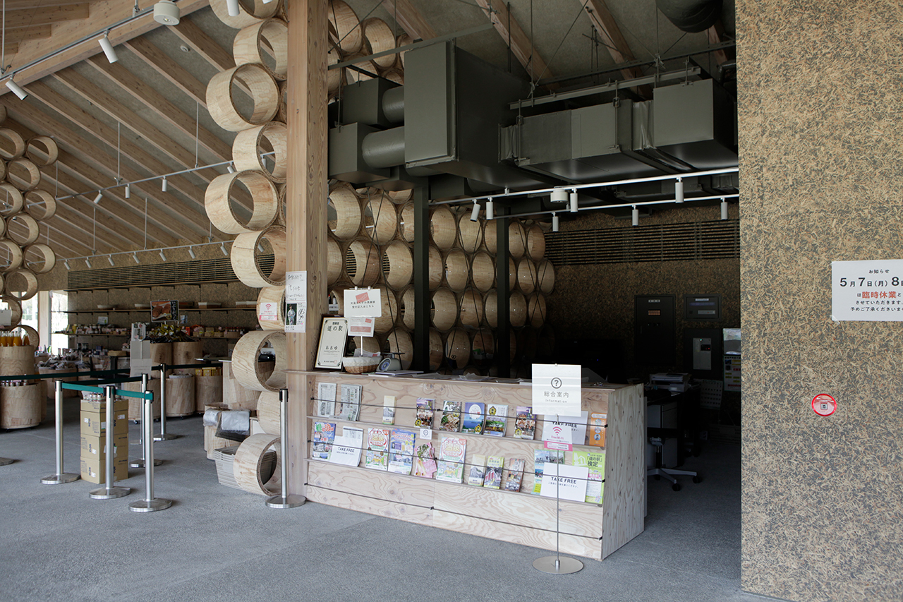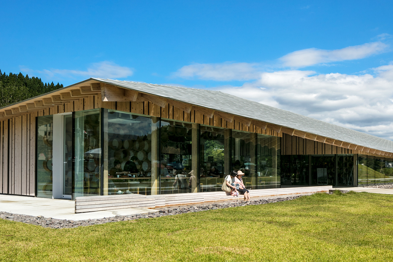 湯の駅のメインエントランスである「大湯えんがわゲート」。駐車場から向かうと、奥には芝生の広場が広がっています。向かって左が「大湯えんがわショップ」、右が「大湯えんがわカフェ」です。