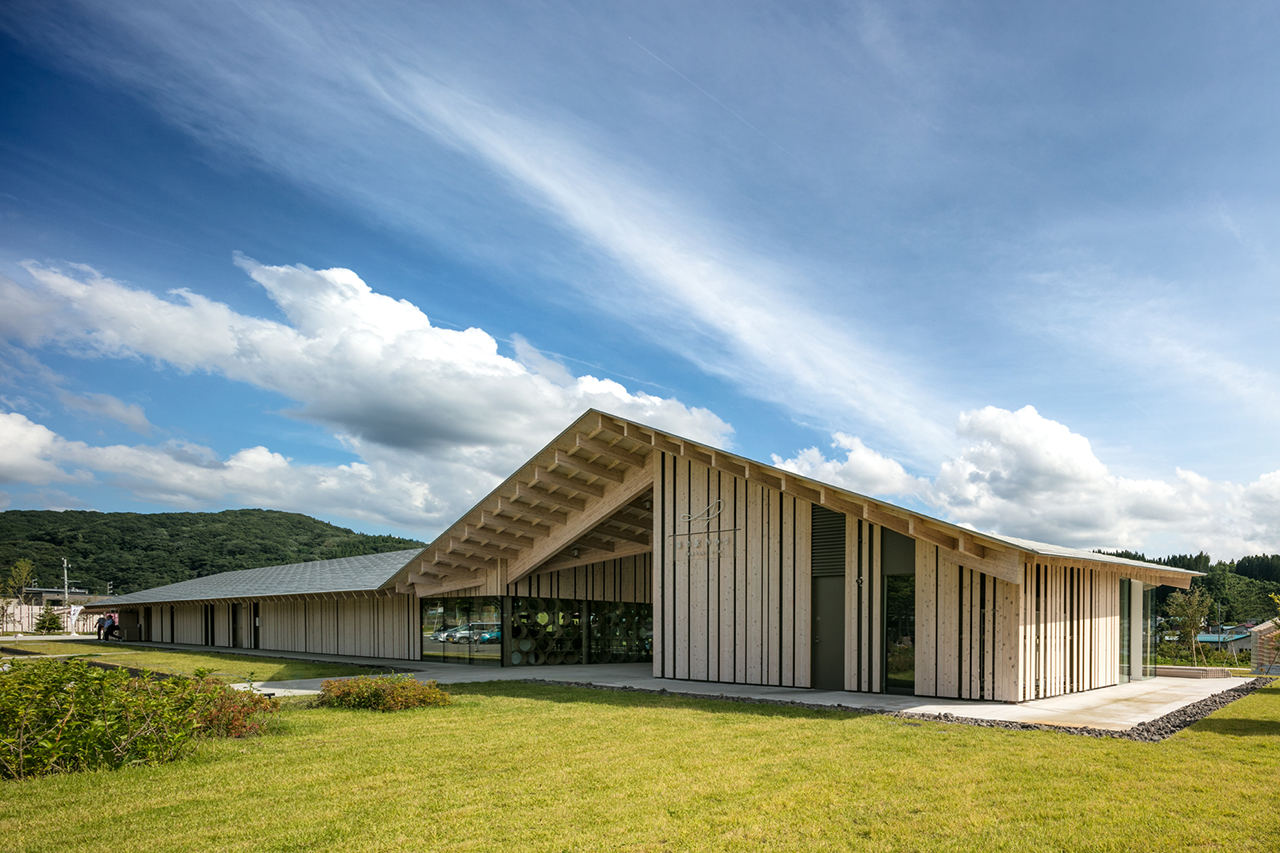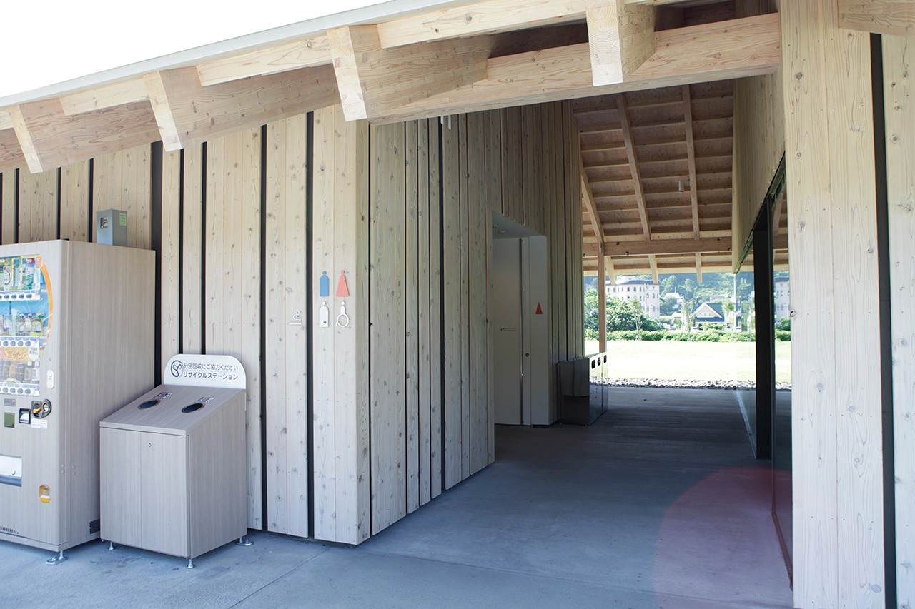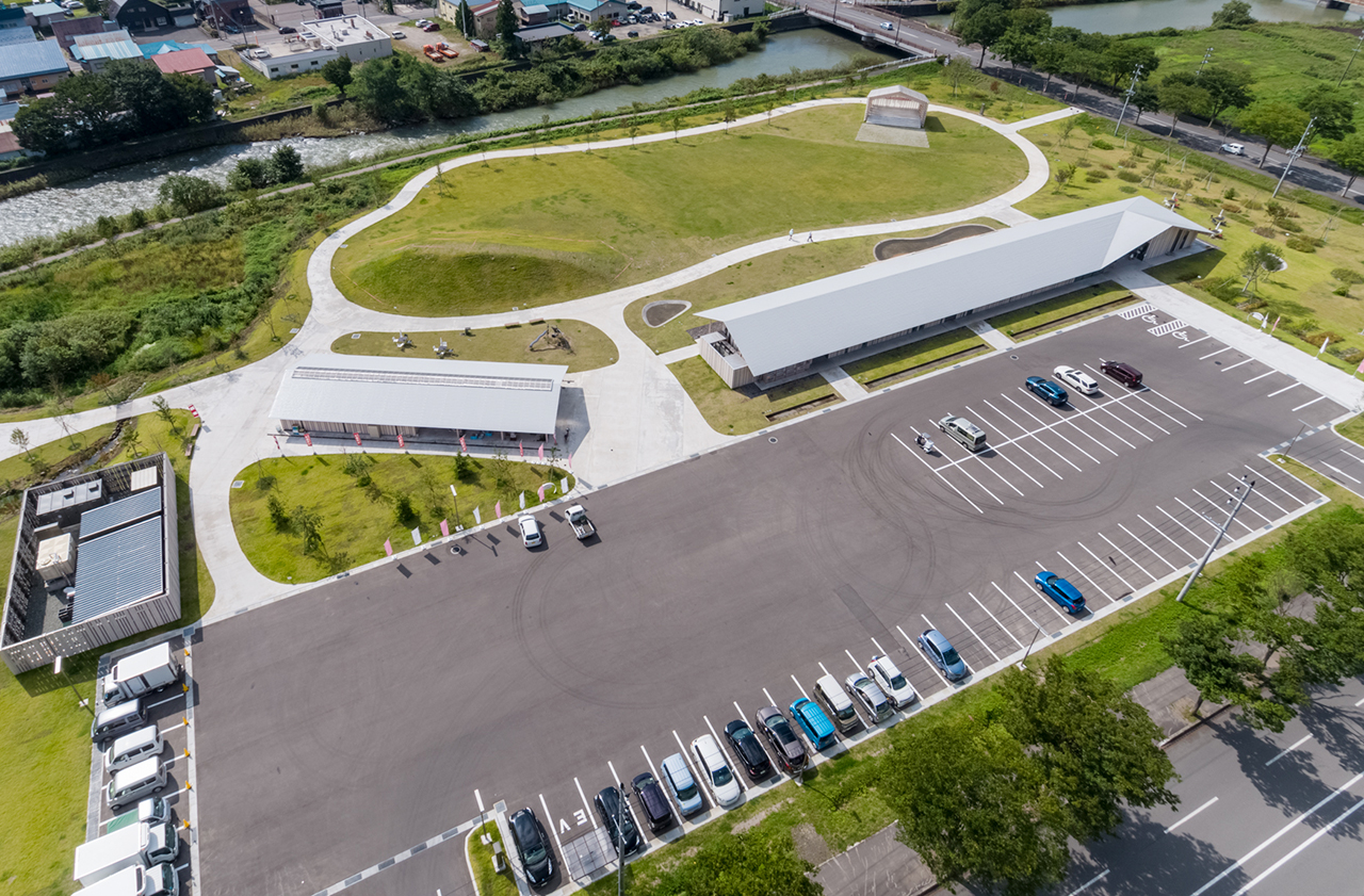 湯の駅のメインエントランスである「大湯えんがわゲート」。駐車場から向かうと、奥には芝生の広場が広がっています。向かって左が「大湯えんがわショップ」、右が「大湯えんがわカフェ」です。