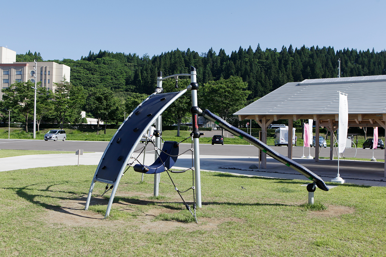 他ではあまりみたことのない、スタイリッシュな遊具です。さて、どうやって遊ぶのか。ぜひ、お子さんと一緒に考えてみてください。お子様だけでのご利用はご遠慮くださいね。